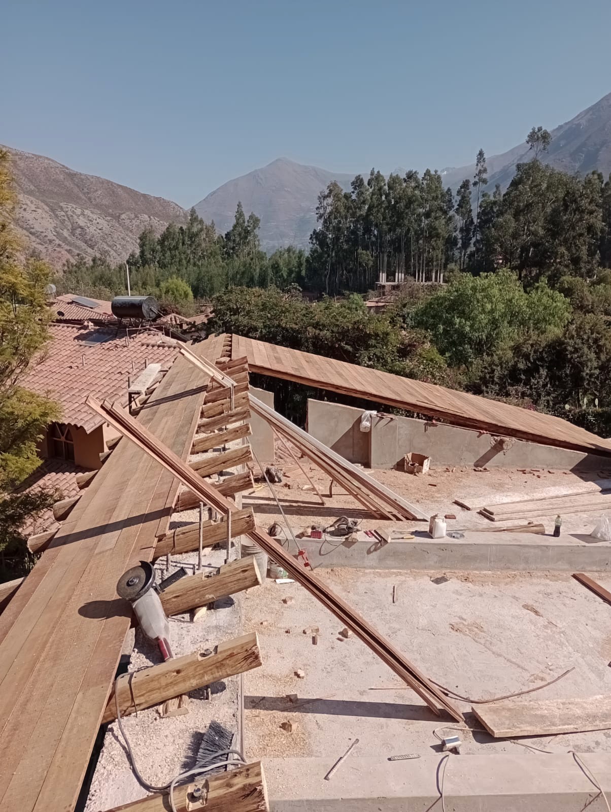 Having had enough of cement, we had planned to make the ceiling of the second floor aguano wood, covered in tile. However, since we wanted to affix 25 solar panels on the roof, Maestro Waly convinced us to pour a second concrete ceiling. This would give us a large work area where we could store all the solar panels, lithium batteries and inverters. It would also give us room to maintain and clean them and avoid breaking any clay tiles. However, this addition increased the height of the building substantially. Carol began to call it our “Castillo” (castle). Fortunately, we were still able to craft a beautiful wood ceiling, albeit underneath the concrete losa! To hide the solar panels, we left a large sun “Inti” sculpture in its place. We also built a graded wall to block out any new neighborhood construction (a constant concern in the Sacred Valley).