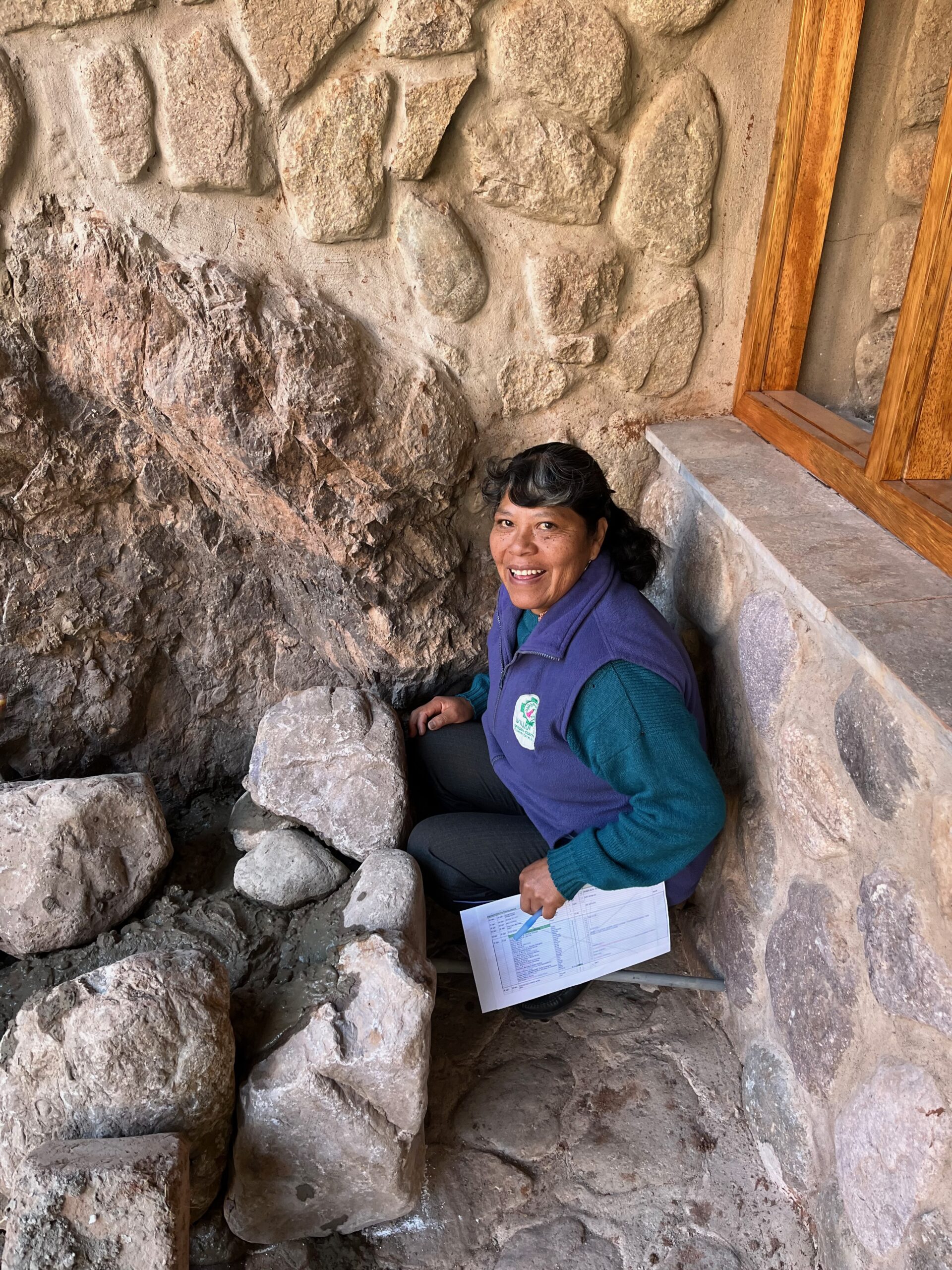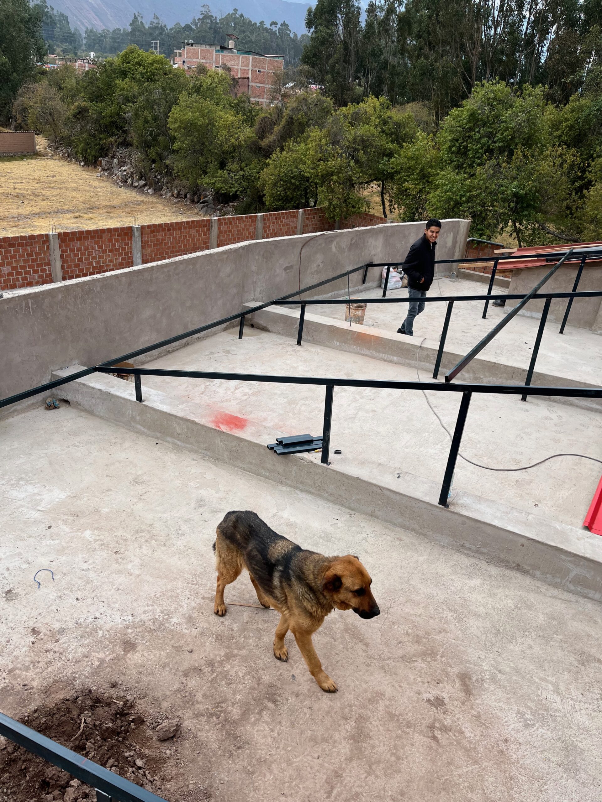 We returned July 8th to find the roof of the second floor completed even better than original specifications. Thanks to Waly’s enthusiasm for our renewable energy initiative, there would be even be room for a few extra solar panels, increasing our installed capacity to 14,400 Watts. In the photos below, you will notice our building inspectors: Kallpa walks on the losa. Apu tests the staircase. Sra Carol looks over the solar panel support structure and Antonia tests out a new stone serving table.