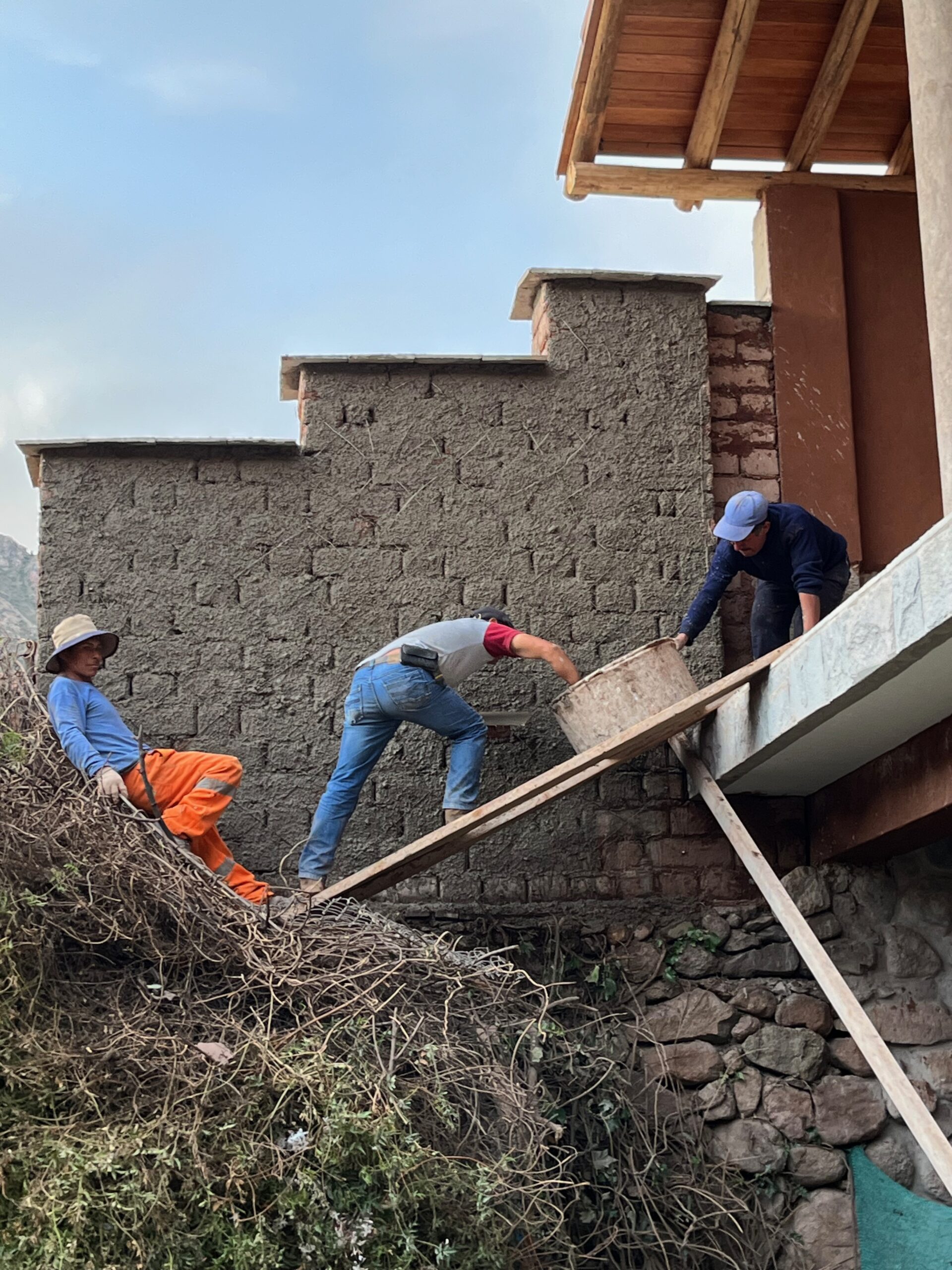 We began the demolition on March 20th with Maestro Waly and his team of Quechua builders. By April 6th, we were ready to start pouring the new foundation. In the Quechua tradition of honoring Pachamama, we made a ceremonial offering of chicha, wine and flowers and buried them in a ceramic mug. On April 24th, our kitchen staff (Mario, Florencio, Livio and Roxana) decided they did not want to weave around a large concrete pillar while they served dinner. So we made our second course correction and toppled the central pillar, replacing it with “vigas colgantes” or side support beams.